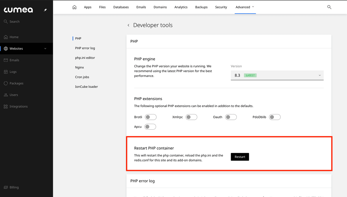 Voit valita haluamasi PHP-version ja tarvittavat moduulit Lumean hallintapaneelista. Seuraa näitä ohjeita: